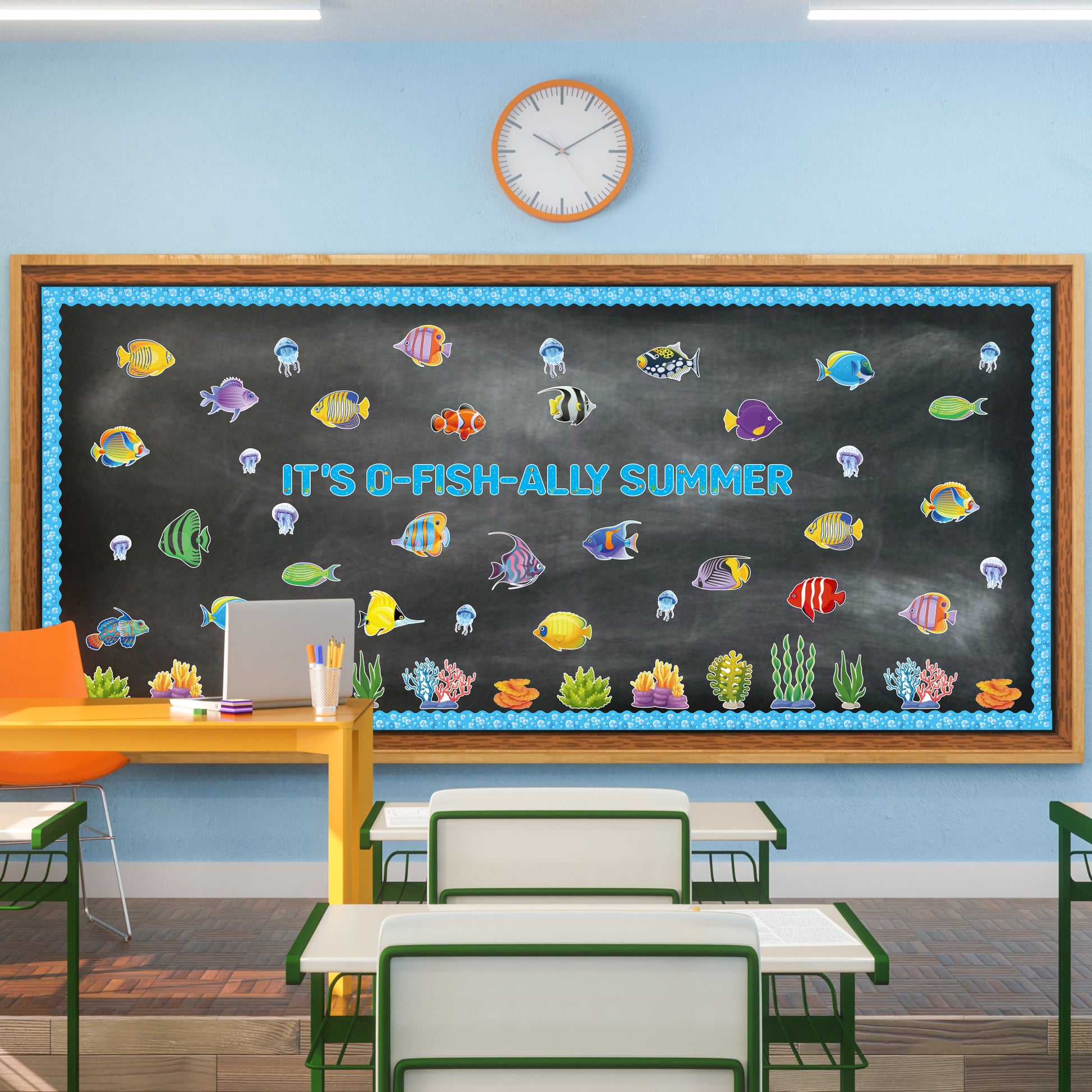 Summer Fish Ocean Bulletin Board Cutouts: This bulletin board set includes 151 pieces, including 21 pieces English word ( IT'S O-FISH-ALLY SUMMER), 3 pieces of each of 20 fish, 2 pieces of each of 7 coralline seaweed, 4 pieces of each of 4 jellyfish, 30 pieces of border and 10 pieces of glue sticker. The product is rich in color and clear in pattern and informative summer fish themed display.