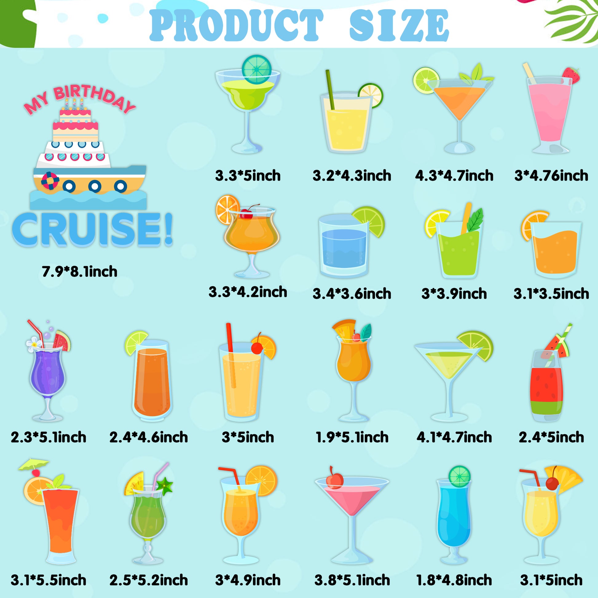 Quality Materials: Made from pvc and soft magnetic, these summer drink cruise door decorations are durable, safe, and long-lasting. The cruise magnets are also easy to clean and maintain, ensuring that they remain in good condition for years to come.Unique Design: The My Birthday drink cruise magnetics set feature a drink-themed design, bright and vibrant colors that are sure to capture children's attention. The magnetics are also designed with unique patterns and shapes, making them visually appealing and stimulating.Wide Applications: These drink cruise door decorations can be applied on many smooth and magnetic surfaces, such as embellish your carnival cruise, ship, boat, car, door, refrigerator, computer, metal mailbox, cabin, dishwasher and so on, available for cruise themed parities, boat traveling, summer parties, birthday parties and other occasions.Suitable Size & Portable: These summer hawaiian lemon cocktail cruise door magnets are designed in appropriate sizes, portable and lightweight, you can stick them on the cruise door without taking up too much space, and they will not take up too much space to store after decorating. Perfect for on-the-go play or for taking along to playdates or trips.Description