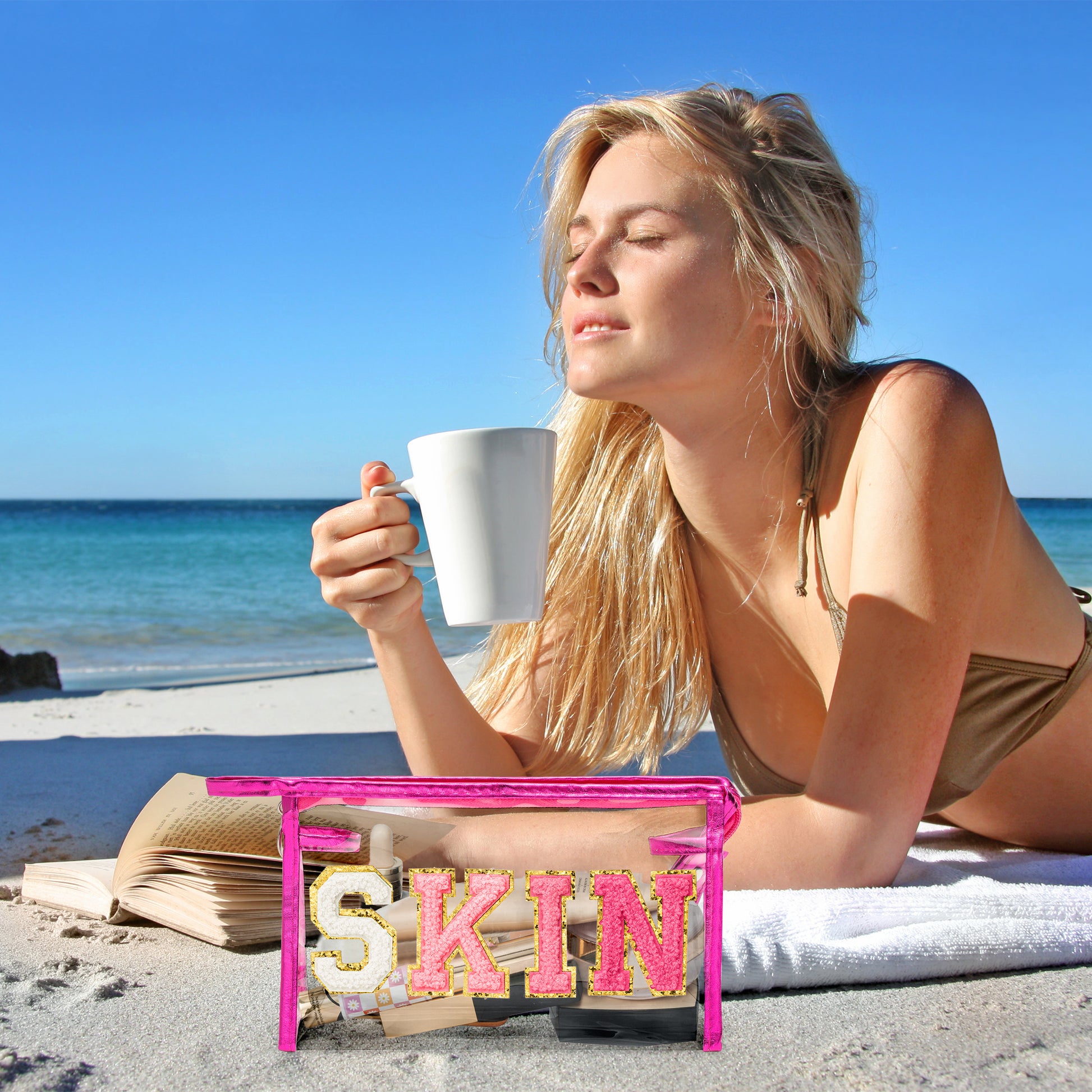 AsodSway Gradual Rose SKIN Cosmetic Bag - Varsity Patch SKIN Letter Cosmetic Bag Waterproof Portable Transparent Rose Red Frame PVC Zipper Clutch Bag Travel Summer Party Makeup Bag for Women Girls