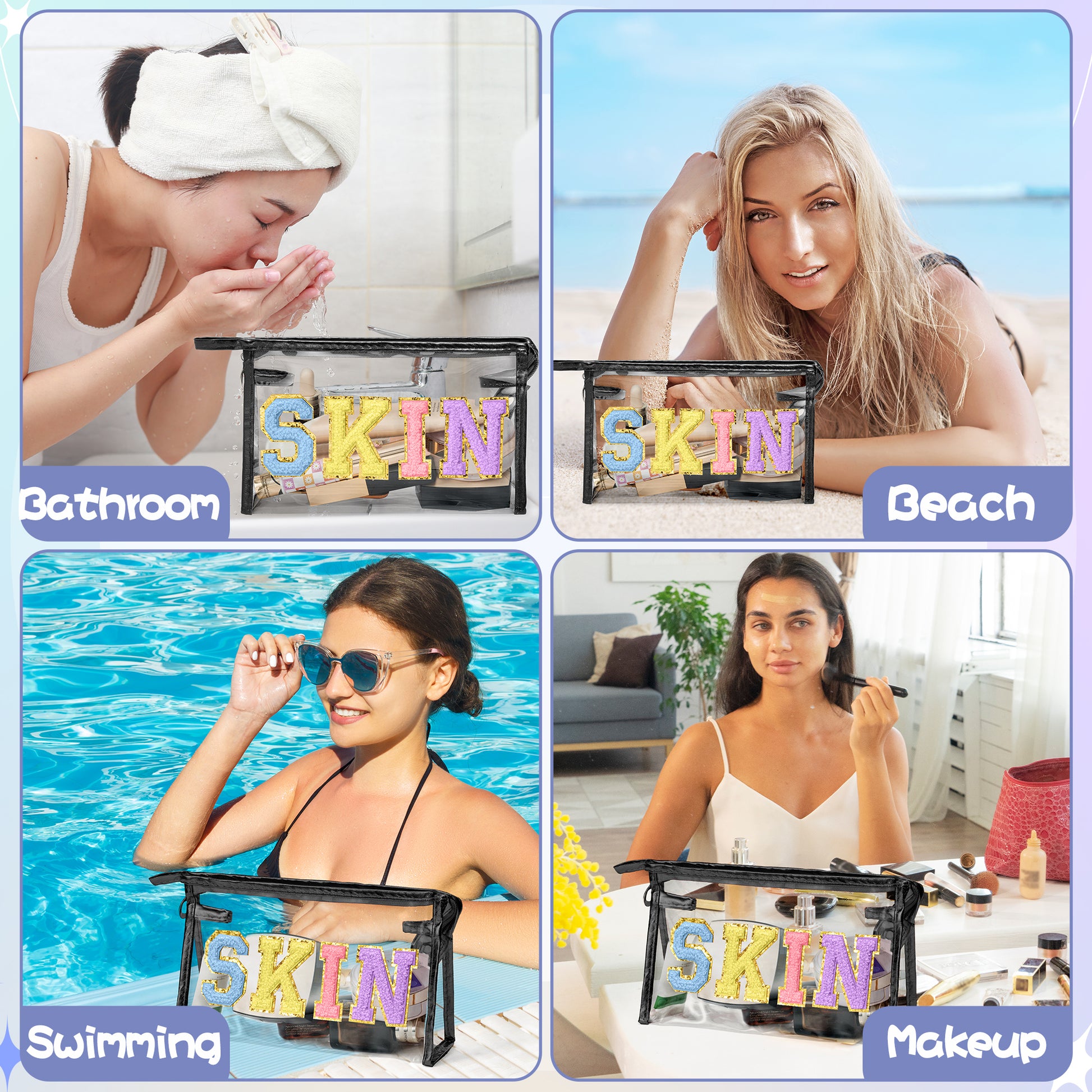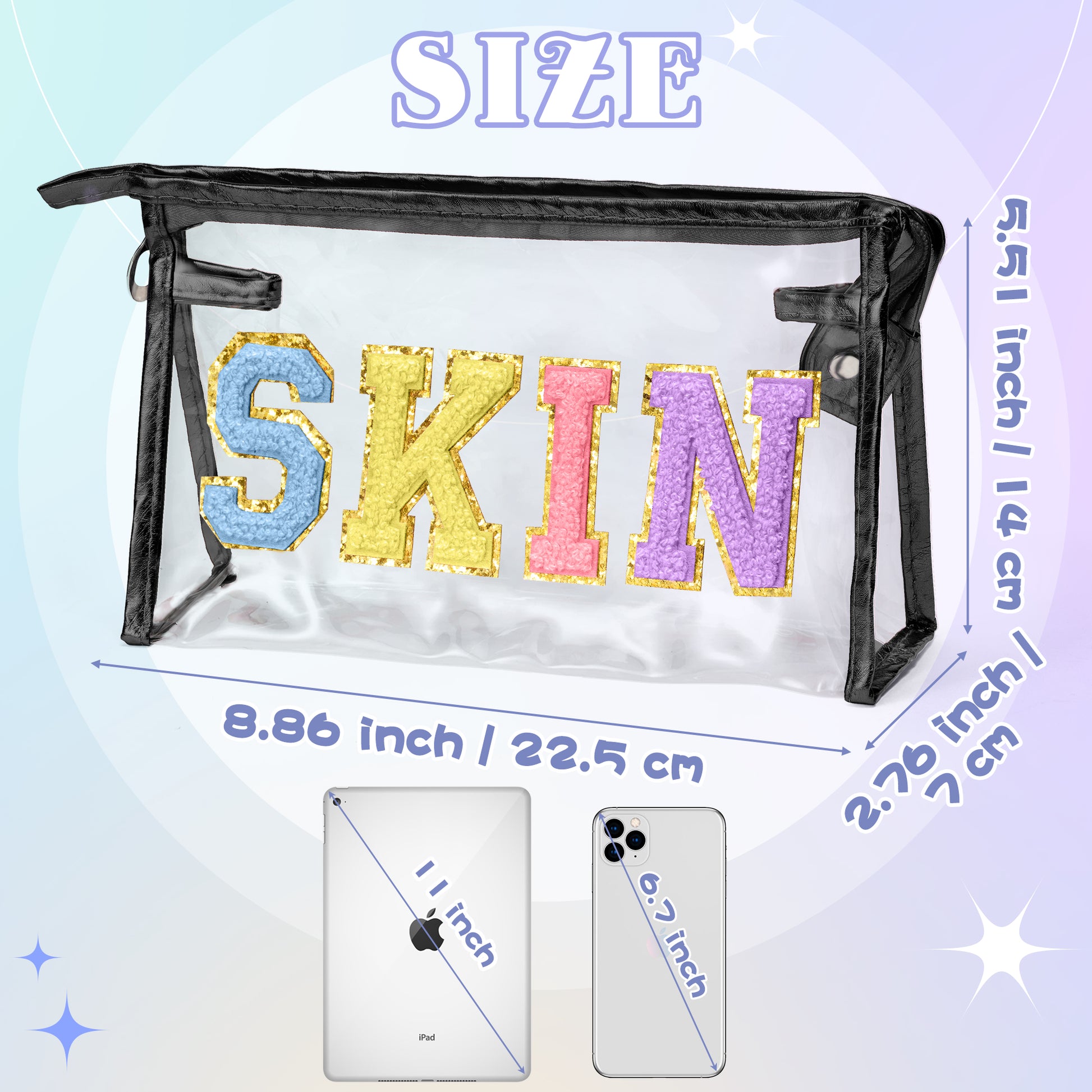 AsodSway Pastel Color SKIN Cosmetic Bag - Varsity Patch SKIN Letter Cosmetic Bag Classy Waterproof Portable Transparent Black Frame PVC Zipper Clutch Bag Travel Summer Party Makeup Bag for Women Girls