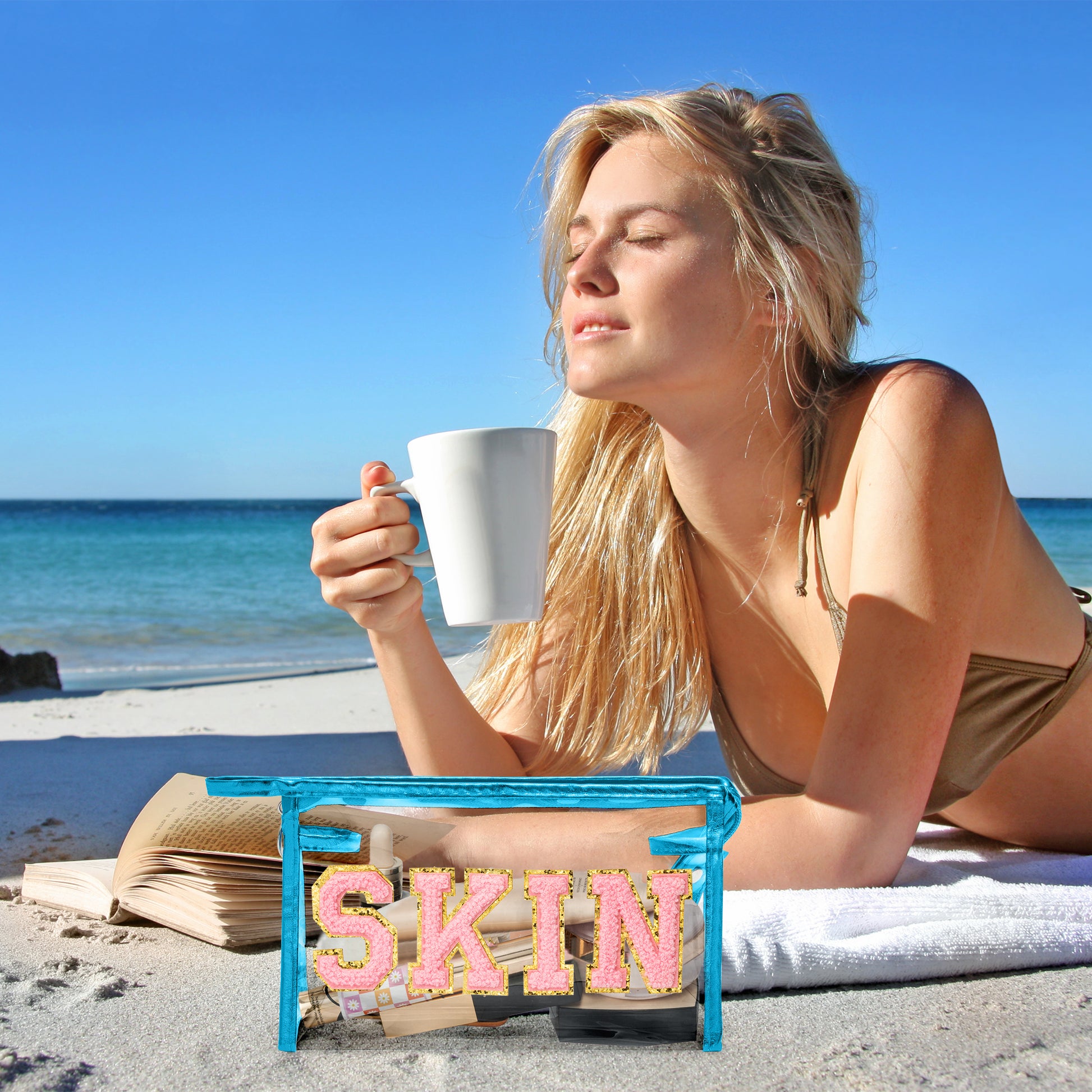 AsodSway Pink SKIN Cosmetic Bag - Varsity Patch SKIN Letter Spring Cosmetic Bag Classy Waterproof Portable Transparent Azure Frame PVC Zipper Clutch Bag Summer Travel Party Makeup Bag for Women Girls