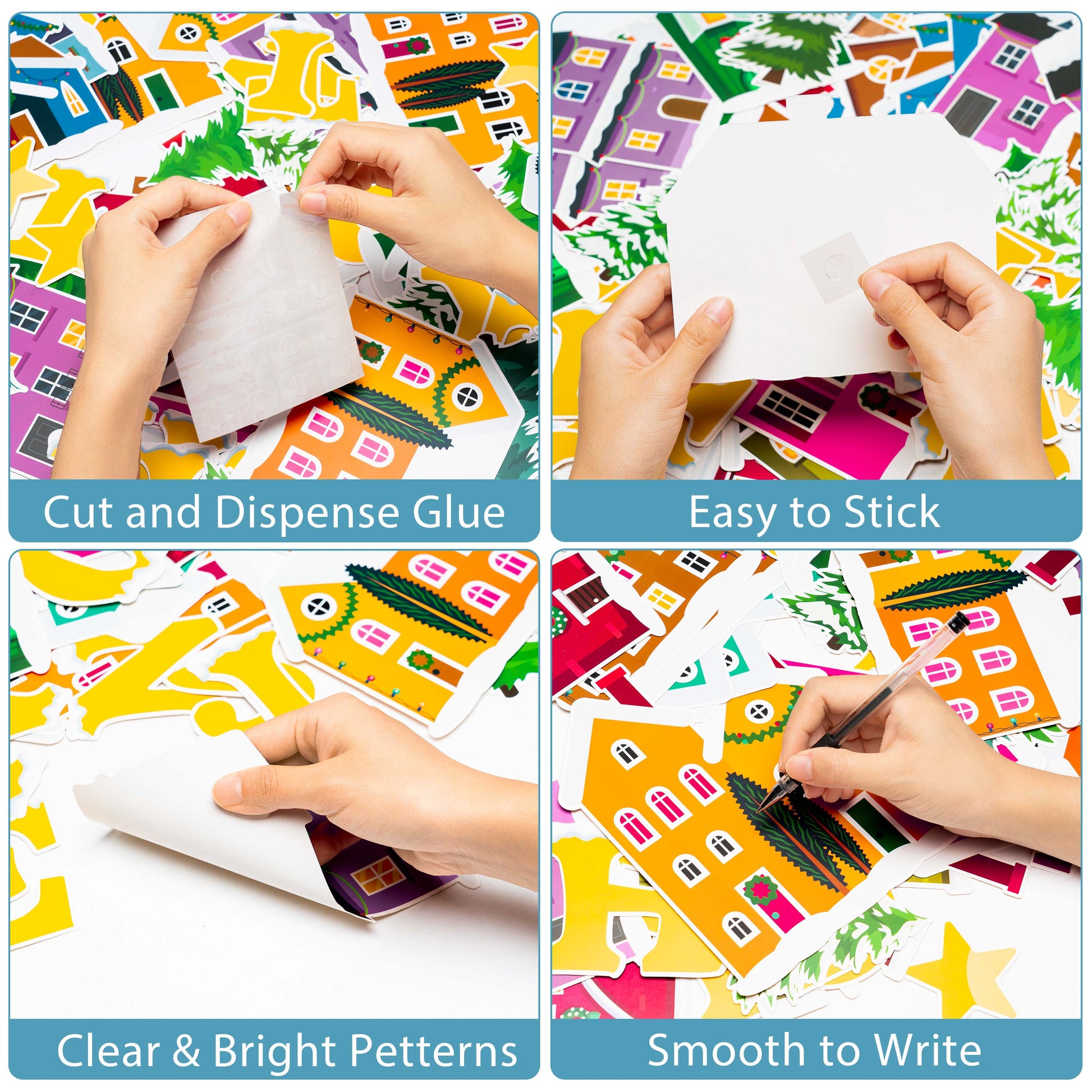 Christmas Town Cutouts Set: The package contains 12 styles winter village houses cut-outs (total 40), 9 styles Christmas Trees (total 18), 20 Pieces English,15 Pieces Star,5 sheets of dispensing paper. Exquisite workmanship and vivid patterns.