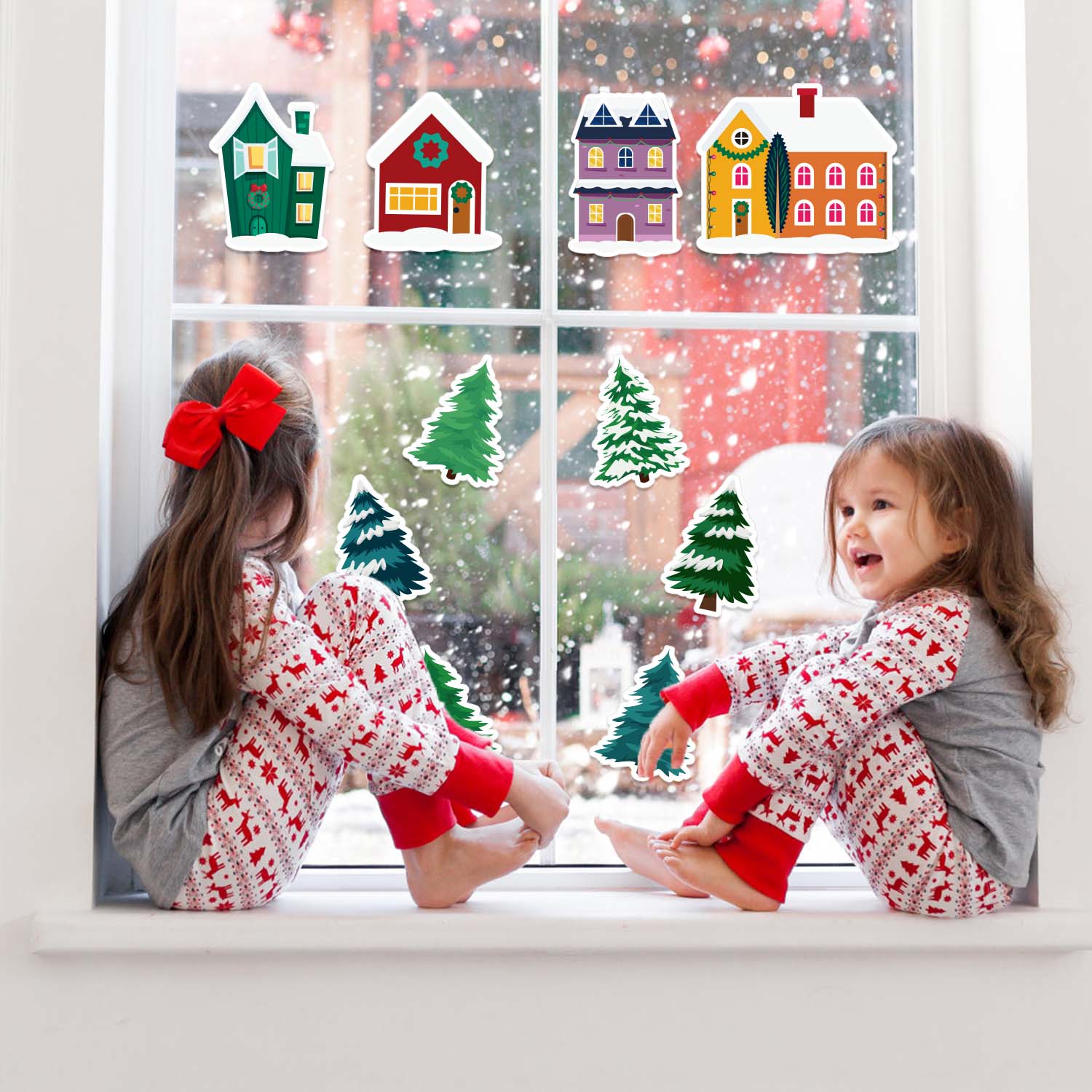 Christmas Village Atmosphere: it is incredible to make an Christmas village with these Christmas village accessories including winter village houses, pine trees, star, English, can be applied on tile, window, classroom wall, also can be a school bulletin board decoration, creating a happy winter atmosphere.