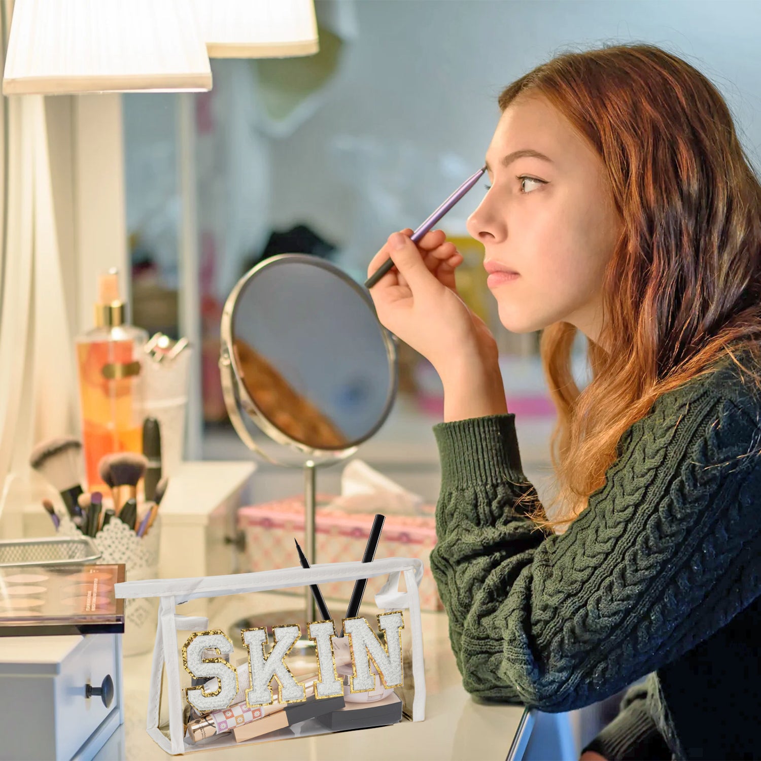 Preppy Patch SKIN Bag Varsity Letter Cosmetic Toiletry Bag Aesthetic Waterproof Portable Cosmetic Bag Daily Use Clutch Purse Transparent PVC Zipper Care Bag Travel Party Makeup Bag for Women Girls